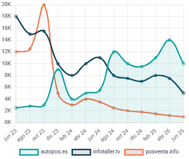 En la siguiente tabla, una comparativa entre los principales medios especializados en posventa en el periodo marzo-mayo de 2025-el dato que arroja la tabla no es el acumulado sino la media de los tres meses-.